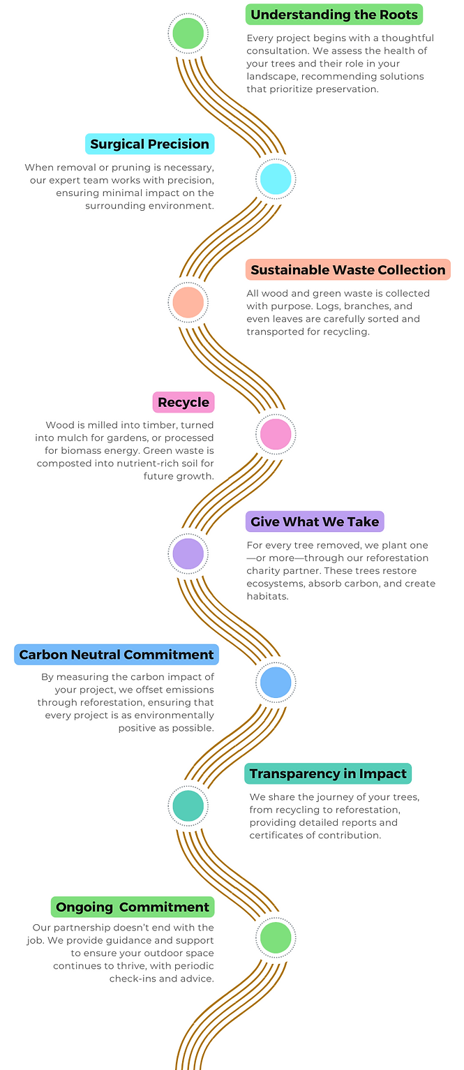 Roots to Renewal is our commitment to responsible tree care and environmental stewardship. At Root to Crown, we believe every tree tells a story, and when a tree must come down, its journey doesn’t end there. Through thoughtful recycling, sustainable waste management, and partnerships with reforestation charities, we ensure that every branch, leaf, and trunk contributes to something greater. From revitalising your landscape to planting new forests, Roots to Renewal transforms tree care into a lasting legacy for your property and the planet.