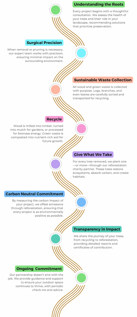 For every tree removed, we plant one or more new ones through our reforestation charity partner. These trees restore ecosystems, absorb carbon, and create habitats.